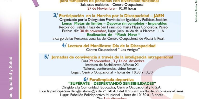 3- Participación en la Marcha por la Discapacidad – JAEN- Organizado por la Delegación Provincial de Igualdad y Políticas Sociales. Lema: Metas sin límites–Deporte sin complejos – Imparables. Recorrido salida Plaza de San Francisco hasta Plaza Concordia. Paseo. 30 de noviembre.