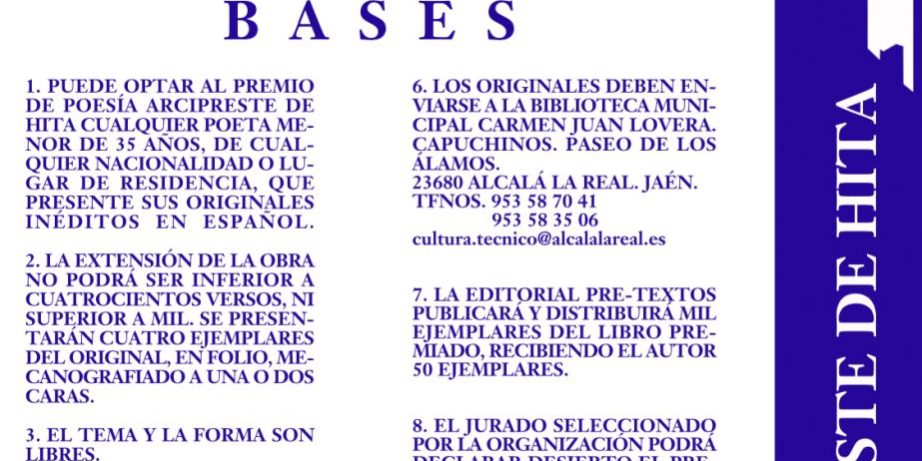 21 de octubre del 2019El área de Cultura del Ayuntamiento de Alcalá la Real convoca el 41º Premio de poesía “Arcipreste de Hita”. Podrán optar al mismo poetas menores de 35 años, de cualquier nacionalidad o lugar de residencia, que presenten sus originales inéditos en español.
