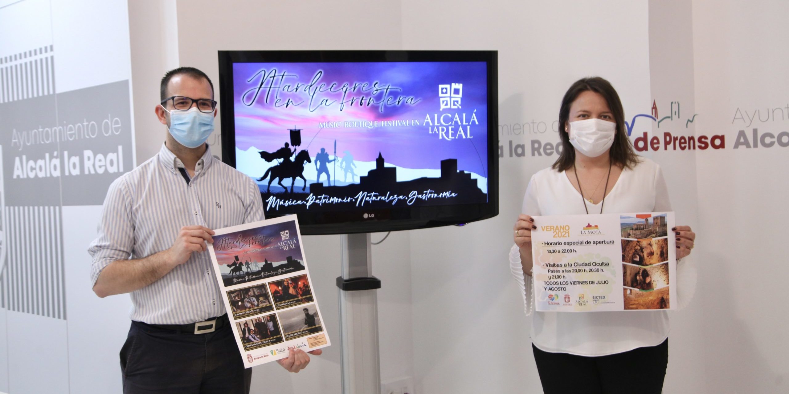 El concejal de Turismo, Juan Manuel Marchal y la coordinadora local de Tu Historia, Mª Eugenia Gil, han presentado este mediodía las propuestas turísticas estivales para este 2021. Se centran en el programa de conciertos enmarcados dentro de la iniciativa “Atardeceres en la Frontera” que se desarrollará entre el 25 de junio y el 23 de julio en dos marcos especialmente indicados para disfrutar del atardecer alcalaíno: la Fortaleza de la Mota y el Mirador de San Marcos. Todas las actuaciones comenzarán a las 21:30 horas.
