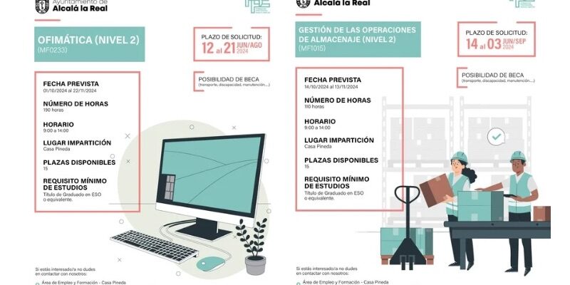 El área de Formación y Empleo informa que se van a impartir dos nuevos cursos de Formación Profesional para el Empleo (FPE), cuyo plazo de inscripción esta ya abierto. Se trata de “Ofimática” y de “Gestión de las Operaciones de Almacenaje”, ambos concedidos por la Junta de Andalucía, dentro de la subvención en materia de Formación Profesional para el Empleo, en la modalidad de oferta dirigida a personas desempleadas para el año 2023.