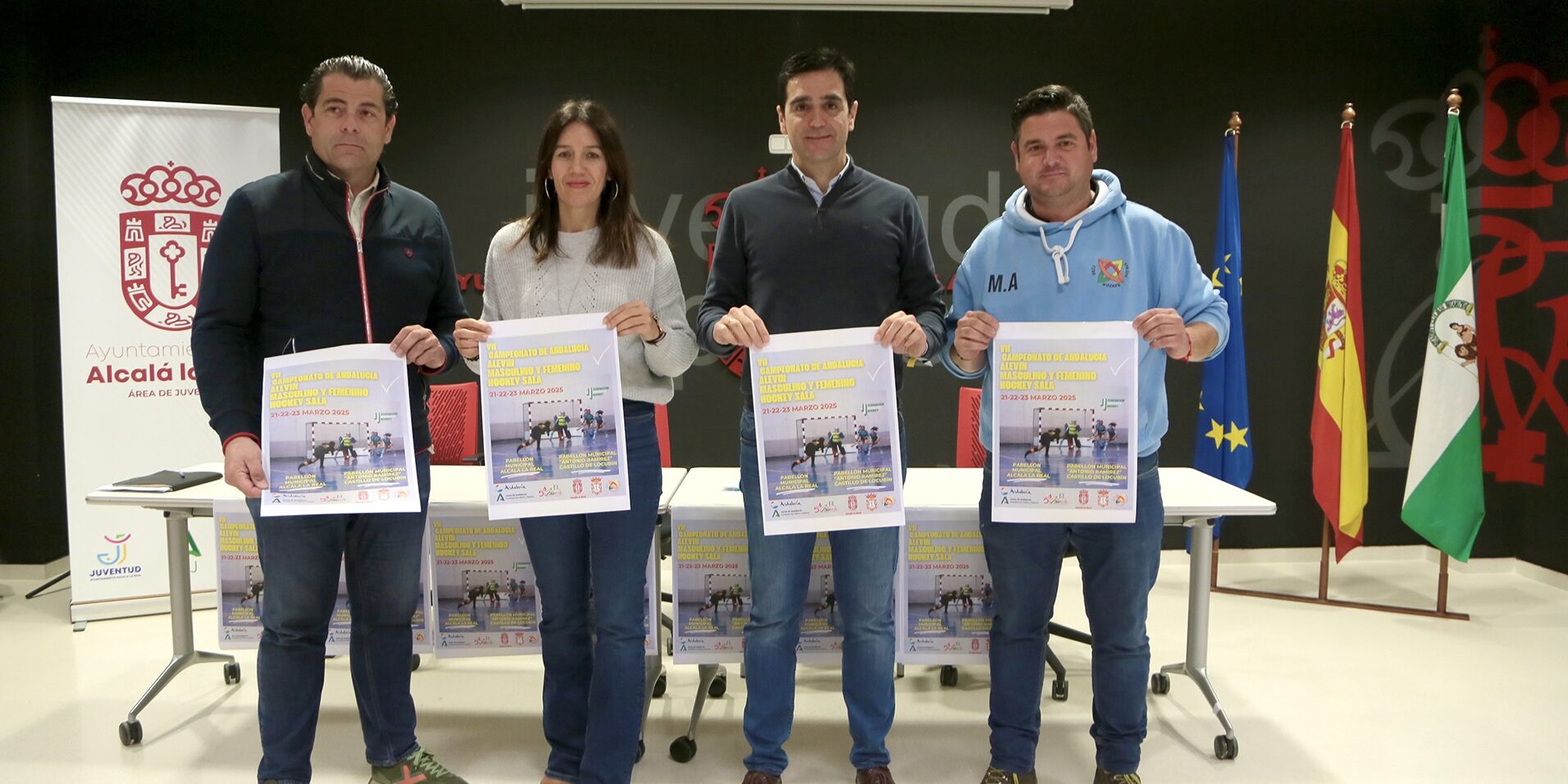 El alcalde, Marino Aguilera; el presidente de la Federación Andaluza de Hockey (FAH), Antonio Aguilera; la edil de Deportes, Belén Ramírez; y el presidente del Club de Hockey Alcalá, Miguel Ángel Alba, han presentado este mediodía el VII Campeonato de Andalucía Alevín de Hockey Sala, que tendrá lugar del 21 al 23 de marzo.