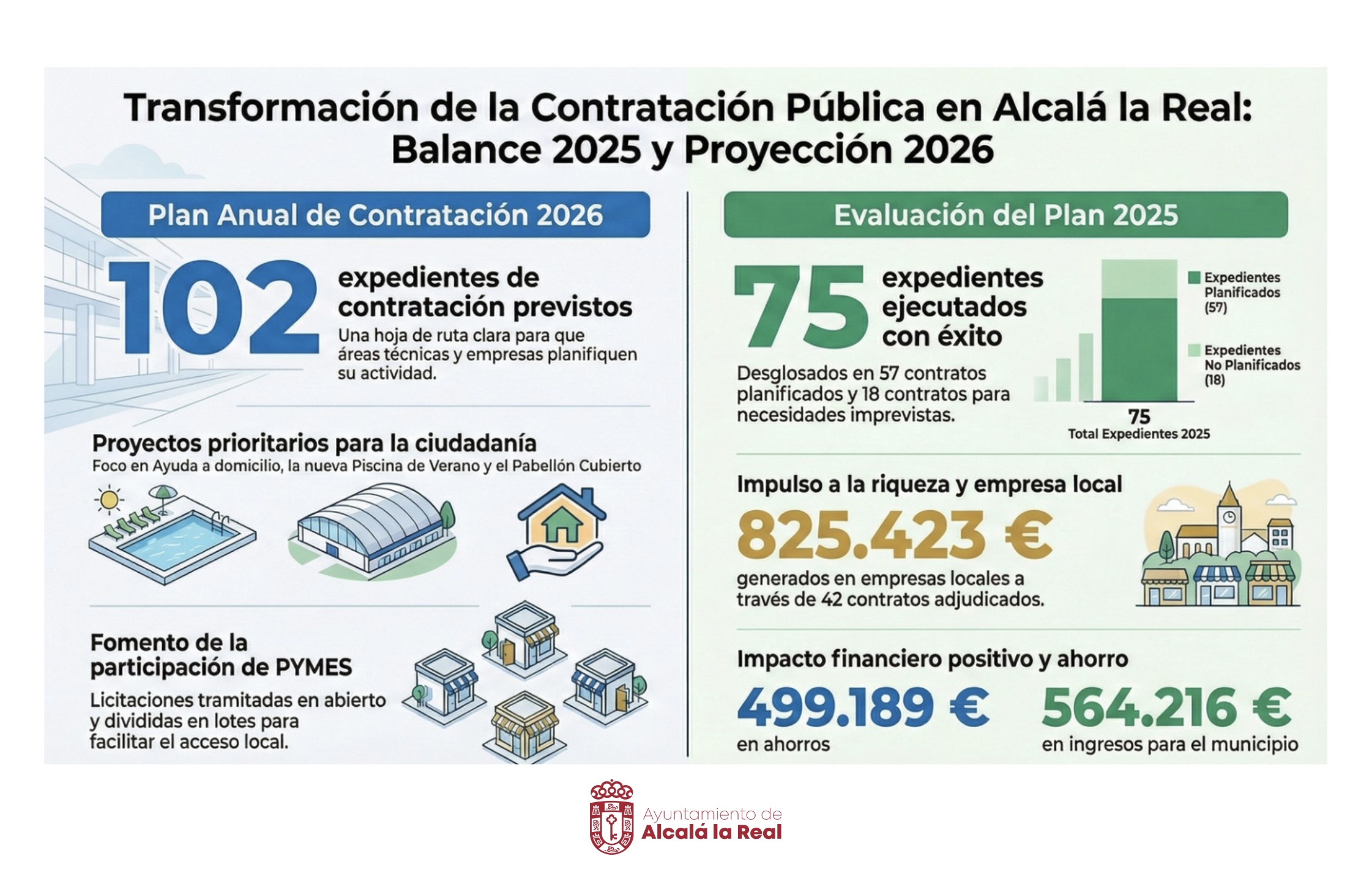 La evaluación refleja un ahorro de 499.189,37€, ingresos por 564.216€, ausencia de litigiosidad y un notable impacto local, con 42 contratos adjudicados a empresas del municipio, lo que ha generado 825.423,43€ de ingresos en la economía local.