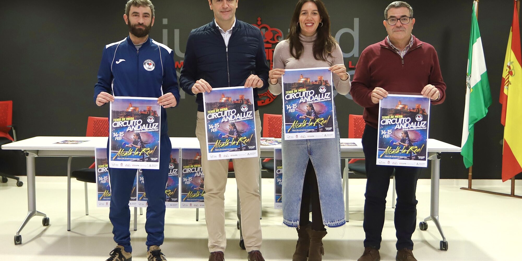 El alcalde, Marino Aguilera; la concejal de Deportes, Belén Ramírez; el presidente de la Federación Andaluza de Tenis de Mesa, Esteban Rodríguez; y el director deportivo del torneo y responsable del Club de Tenis de Mesa de Alcalá la Real, Francisco Carrillo, han presentado este mediodía los eventos que acogerá el municipio este fin de semana y que congregarán a más de 200 deportistas.