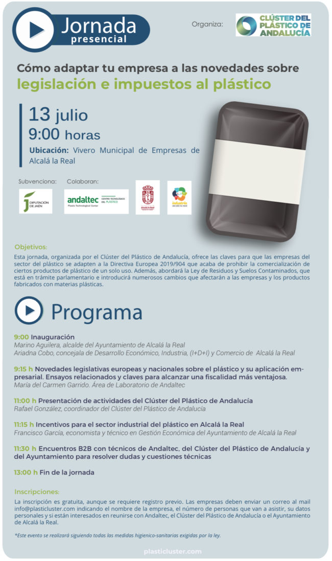 El Clúster de Plástico de Andalucía ha programado la jornada “Cómo adaptar tu empresa a las novedades sobre legislación e impuestos al plástico” de forma presencial y abierta a todas las empresas del sector del plástico, sean o no miembros del Clúster. La inscripción es gratuita, aunque se requiere un registro previo. Las empresas deben…